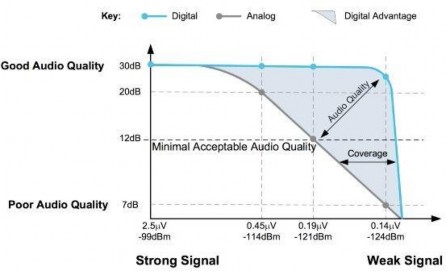 Calidad de audio Digital frente a analógicoMientras que una señal analógica perderá calidad y legibilidad a medida que disminuya la intensidad de la señal, una señal procesada digitalmente seguirá siendo nítida hasta que se pierda la señal.