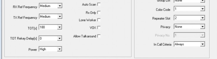 Esto parece más complejo de lo que es en realidad Mode Digital Frecuencia La frecuencia Rx / Tx del repetidor Código de color (El equivalente digital de CTCSS, normalmente 1) Ancho de banda12 ,5 kHz Franja horaria ó 2 (Cualquiera que esté asignada a ese) Contacto Grupo de conversación seleccionado de la Lista de Contactos Contacto de Rx "Ninguno" será por defecto el Contacto de Tx Potencia Alta o Baja Tx Criteria "Channel Free", Código de color, Siempre Lista de exploración Opcional