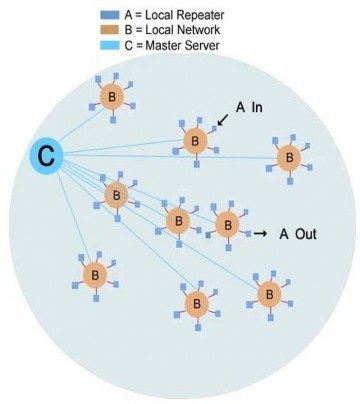 Aquí se muestra un ejemplo de la complejidad de la red. Aunque internet es rápida, no es instantánea. El audio se procesa digitalmente en el dispositivo portátil, se transmite al repetidor y, a continuación, a un servidor regional conectado a una serie de servidores mundiales desde donde se distribuye.